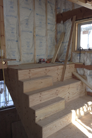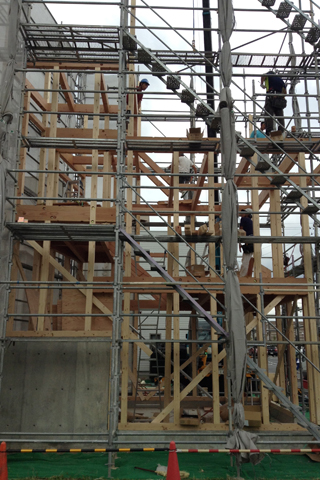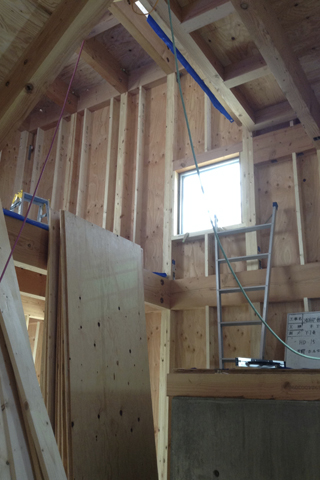 内部にほとんど間仕切りの無い、連続したスペースがらせん状に続いていく住宅の現場です。