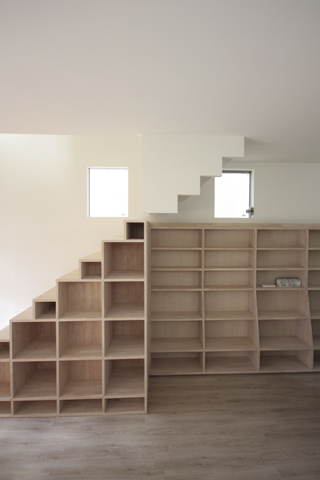 階段下は、紙芝居や大型絵本が置ける本棚にしました。
