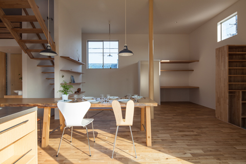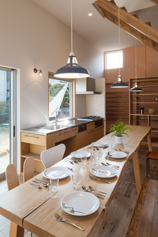 天井の高い、ワンルームのリビング・ダイニングに、 みんなが集まれる大きなテーブルをおきました。